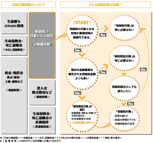 おおまかな相続税額をつかんだら、この税額と現状の現預金・有価証券等の金融資産の合計と比較してみましょう。この金融資産が相続税額 よりも大きければ安心ですが、税額の方が大きい場合は対策を考えておいた方が賢明です。円滑な納税のためには「相続財産の中でまかなう」 ことが理想的です。相続税の納税資金が相続財産もしくは相続人の財産で不足してしまう場合、また、被相続人の相続財産のほとんどが換金性 の低い財産(自宅、土地、自社株等)の場合などは「納税資金確保」のための対策を立てる必要があるといえるでしょう。一般的には生命保険 の活用や資産の組み換えにより金融資産の比率を高める工夫を行うといった対策や相続税額そのものを減らすといった対策が考えられます。
